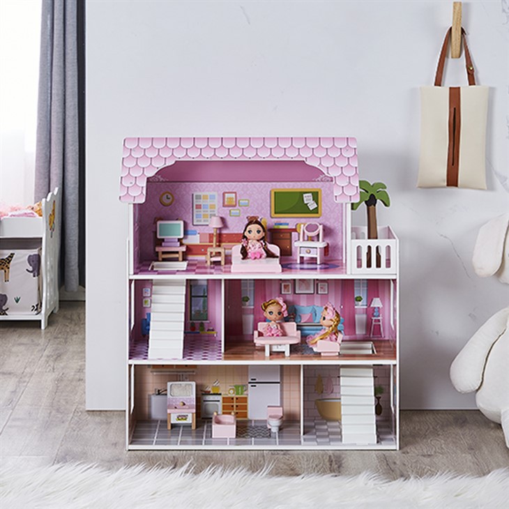 Dieses rosa Aufkleber-Puppenhaus aus Holz besteht normalerweise aus mehreren Räumen, darunter Schlafzimmer, Wohnzimmer, Küche, Badezimmer usw.